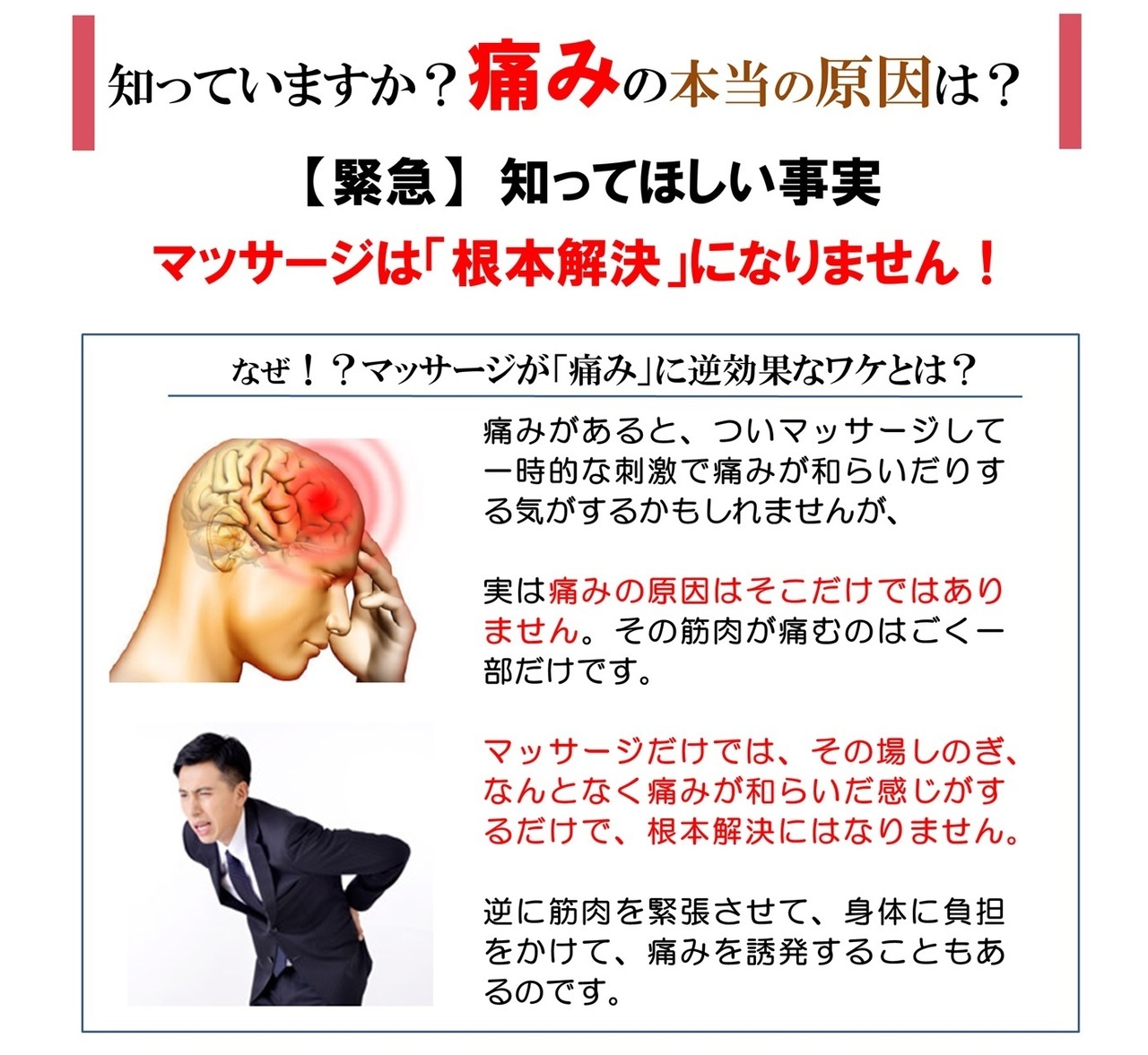 悩み: 姿勢の悪さからくる歪みが原因と思うが、慢性的な頭痛・肩こりをはじめとしたあらゆる症状で調子のよいときが少ない。