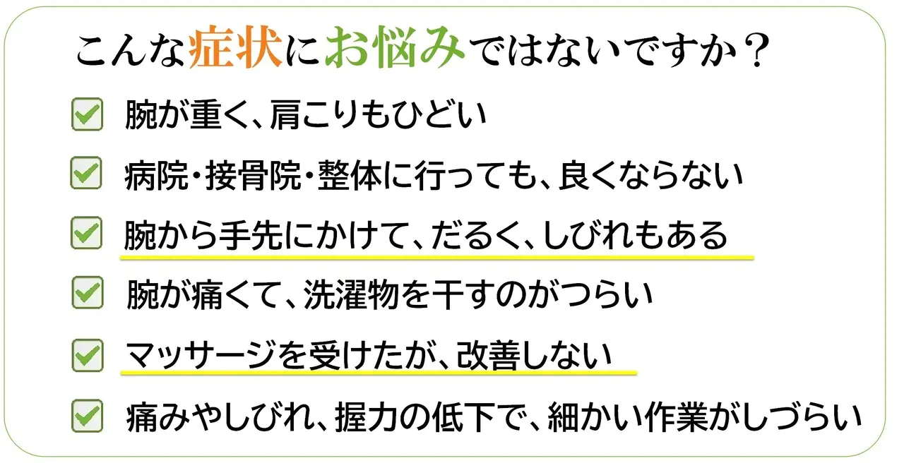悩み: 若いころ脱臼をしたことがあり時々何かの拍子で痛みが戻り、同時に首や背中も痛む
